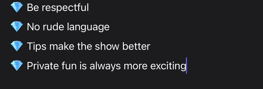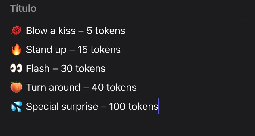 Atuação, Cozinha, Fumantes, Amante, Anal, Cavalgada, Chuveiro, Exibicionismo, Humilhação, Linguagem explícita, Mandar bater uma, Masturbação, Orgasmo, Peitinhos, Penetração com dedos, Punheta, Rebolando, Salto alto, Anais, Massagem, Masturbação com os pés, Sentada na cara, Show com óleo, Striptease
