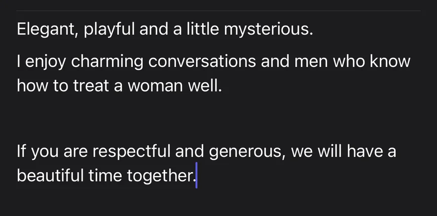 Elegance, charm, and a touch of mischief. I like generous, well-mannered men who know how to appreciate a real woman.